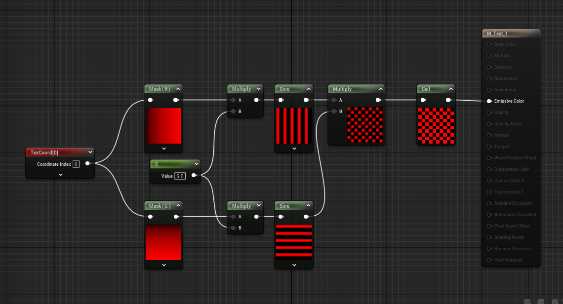 将 U 轴和 V 轴进行乘法,得到一个初始棋盘效果,但是棋盘格中取值范围是-1 ~ 0 和 0 ~ 1,此时使用 Ceil 函数将值变为 0 和 1,得到最后的棋盘效果