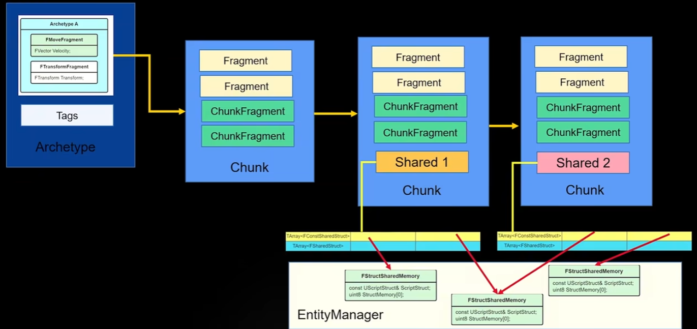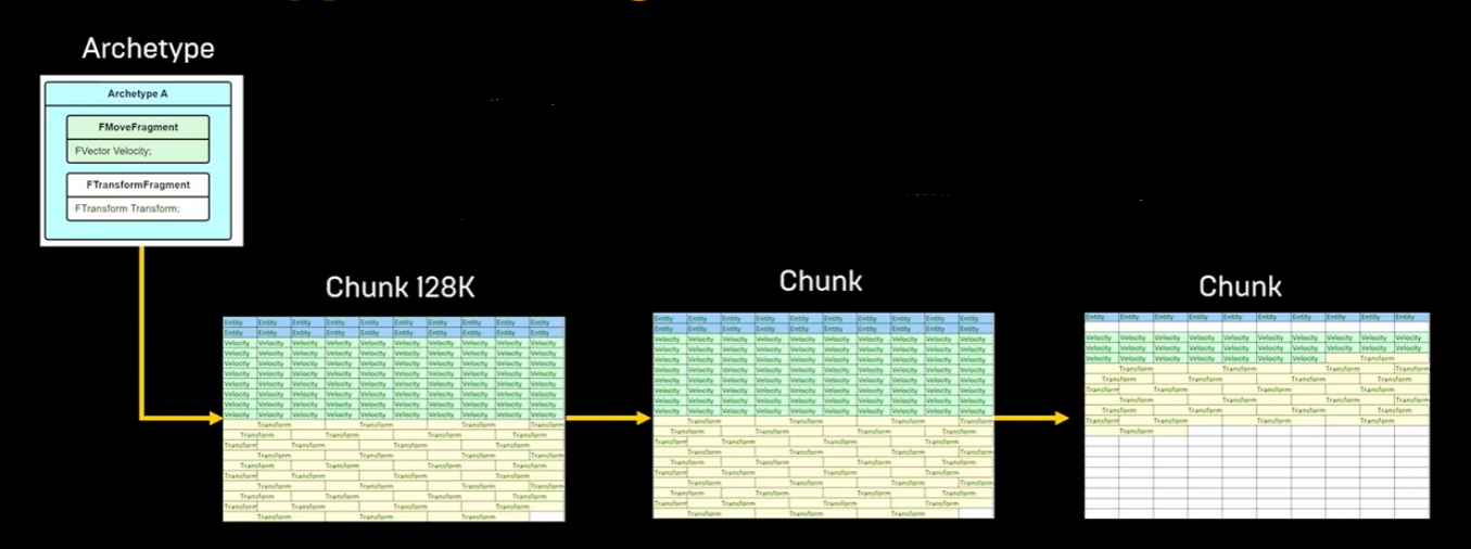 UE 将 Archetype 的存储分为一个个 Chunk, 每个 Chunk 分为 64kb 或者 128kb (对 CPU 的 Cache 比较友好)。Chunk 的大小确定、 Archetpe 的大小确定,可以算出一个 Chunk 可以容纳多少个 Entity 数据