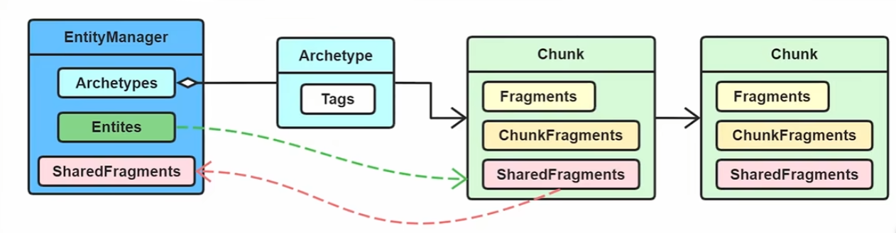 如上,知道一个 Chunk 容纳多少个 Entity 个数据之后,就可以将 Fragment 依次排开,每次取数据的时候只要指针定位到开头,就可以正确访问指定数据