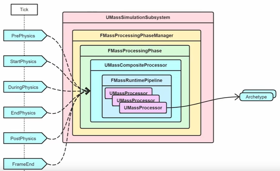Mass 框架的作用就是将 Actor 的 Logic 模块抽离出来,用 Entity 来表示数据,再加上处理器 System 处理,之后根据对应关系更新 Actor 的表现部分